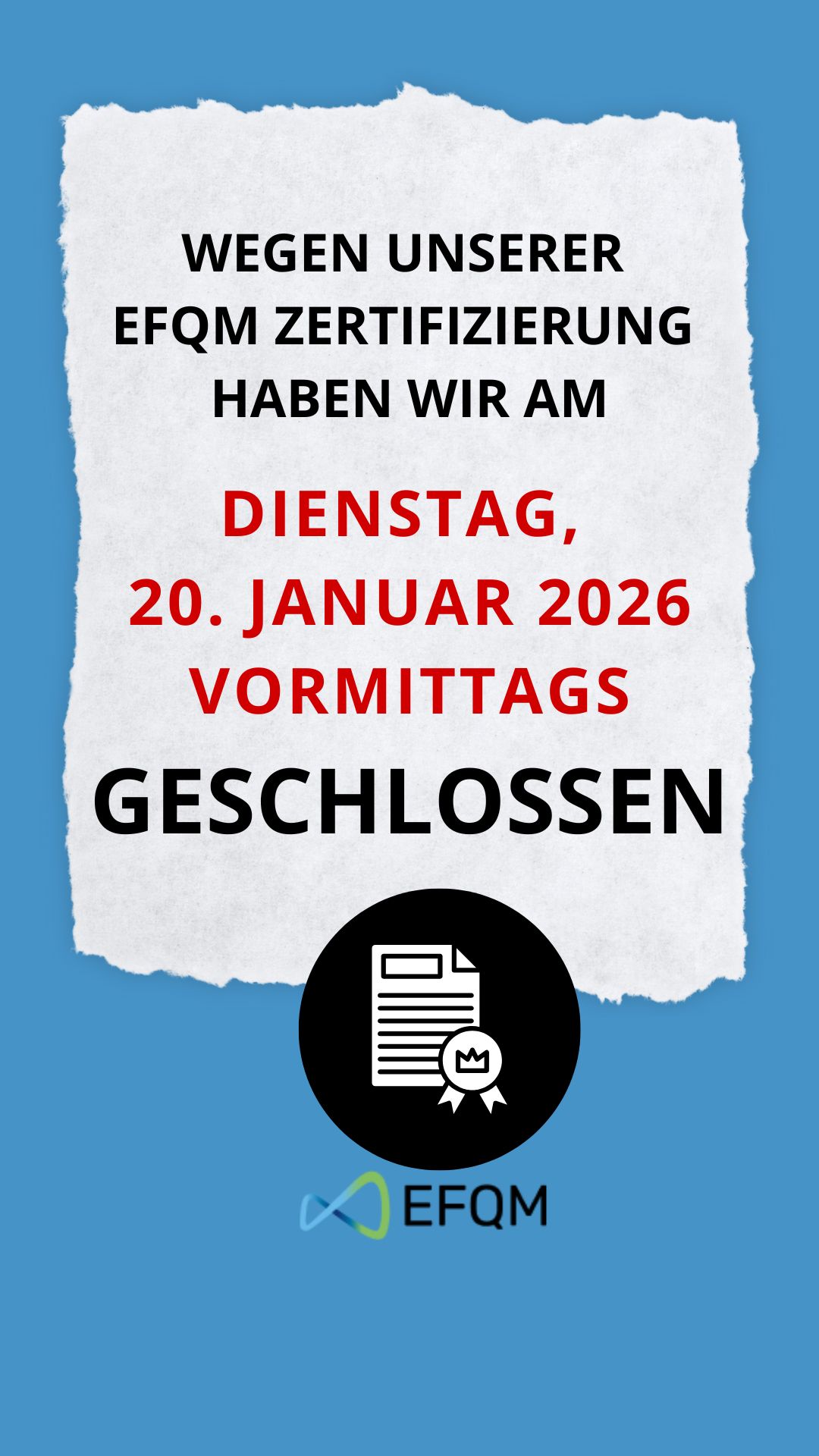 Unser Büro hat wegen unserer EFQM Zertifizierung am 20.1.2026 vormittags geschlossen. Am Nachmittag sind wir wieder wie gewohnt für Sie da.